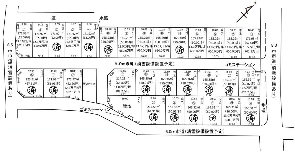 北東側8.0m市道・南西側6.5m市道・南東側6.0m市道・分譲地内道路6.0m市道