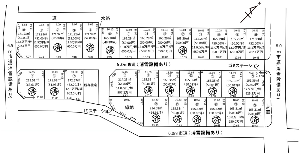 北東側8.0m市道・南西側6.5m市道・南東側6.0m市道・分譲地内道路6.0m市道